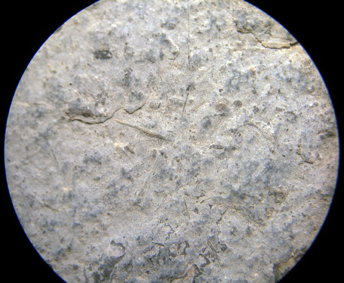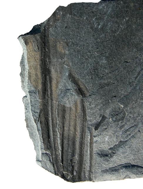 Frammenti di una o due foglie del vegetale enigmatico Phylladelphia stringata conservati su lastra. Phylladelphia stringata è rappresentato da foglie caratteristicamente ampie, a forma di lingua, con una larga zona basale e con evidenti pieghe longitudinali. L'esemplare in esame, pur molto frammentario, presenta queste caratteristiche pieghe. Sul retro della lastra si osservano numerosi piccoli resti aciculari che sono interpretati come spicole di spugna (alternativamente potrebbero essere aculei di echinoidi, ma mancano di un'espansione per l'inserzione sul tubercolo della piastra della teca).