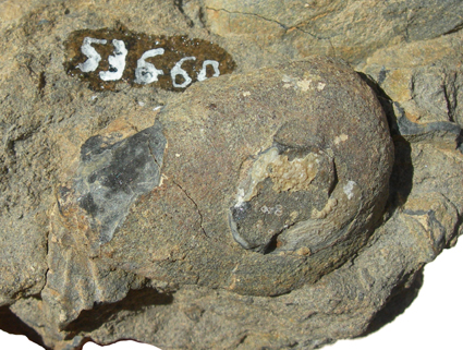 Accumulo conchigliare su frammento roccioso. Si riconoscono quattro valve più o meno complete (due destre e due sinistre) appartenenti a forme diverse, e numerosi altri frammenti di valve, incluso uno o due frammenti di valva di ostreide. Una valva sinistra potrebbe essere riferibile a Trigonodus e forse anche una destra, più piccola conservata vicino. Una valva sinistra priva della porzione posteriore potrebbe essere riferibile a Pachycardia. Infine, una valva destra è ancora in gran parte inglobata nella roccia.