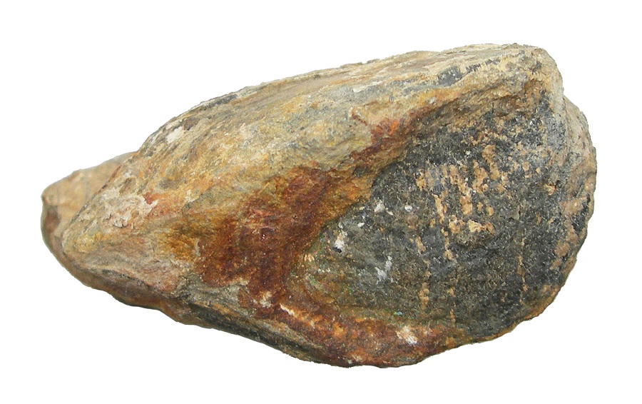 Piccolo frammento di roccia con una conchiglia bivalve completa, i resti incompleti di una seconda conchiglia e frammenti di varie valve, tutti in gran parte incrostati da roccia.