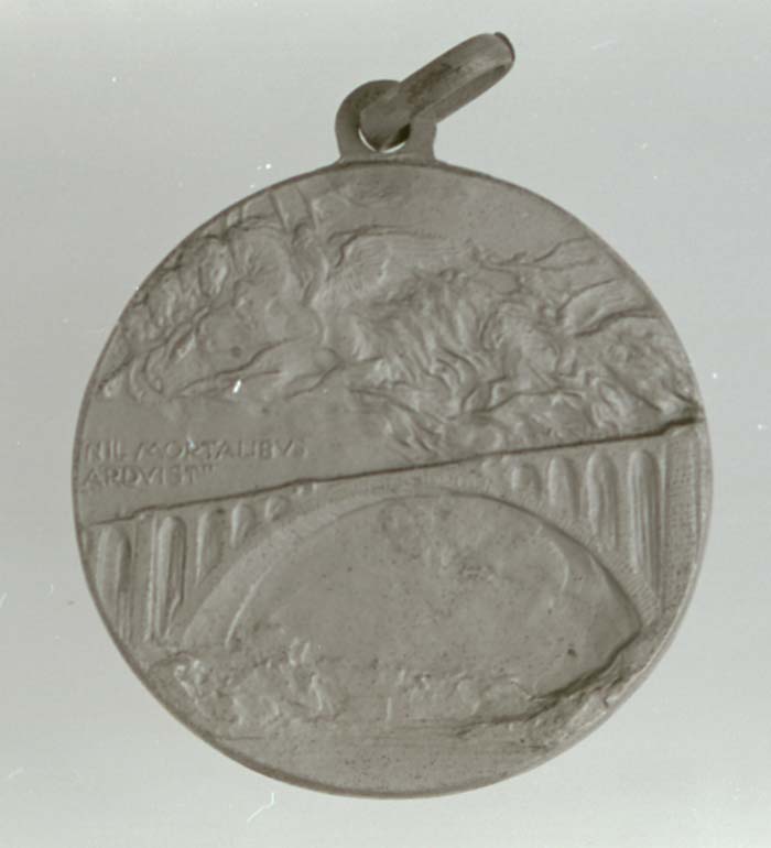 ODIIS.DIRVPTVS/ADVERSAS.RIPAS.ADVERSIS/GENTIBVS.VICTIS.SONTII.FLVMINIS/PONS.LEVIS.VNVS.ARDVE.CELSVS.ARDVE.CELSVS/ITERVM.CONIVNGIT ANNO V. S.J. EM
