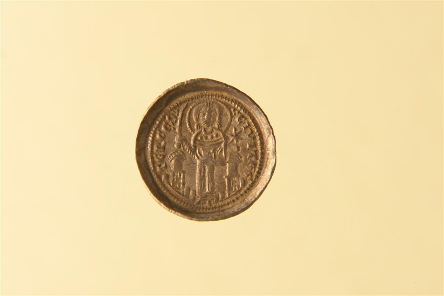 Santo nimbato di fronte, con palma nella d. e libro sul petto con la s. davanti alle mura della città chiuse da due torri con cupole; nel campo a destra stella a sei punte; cerchio perlinato (triangolo di globetti)CIVITAS TERGES(triangolo di globetti)