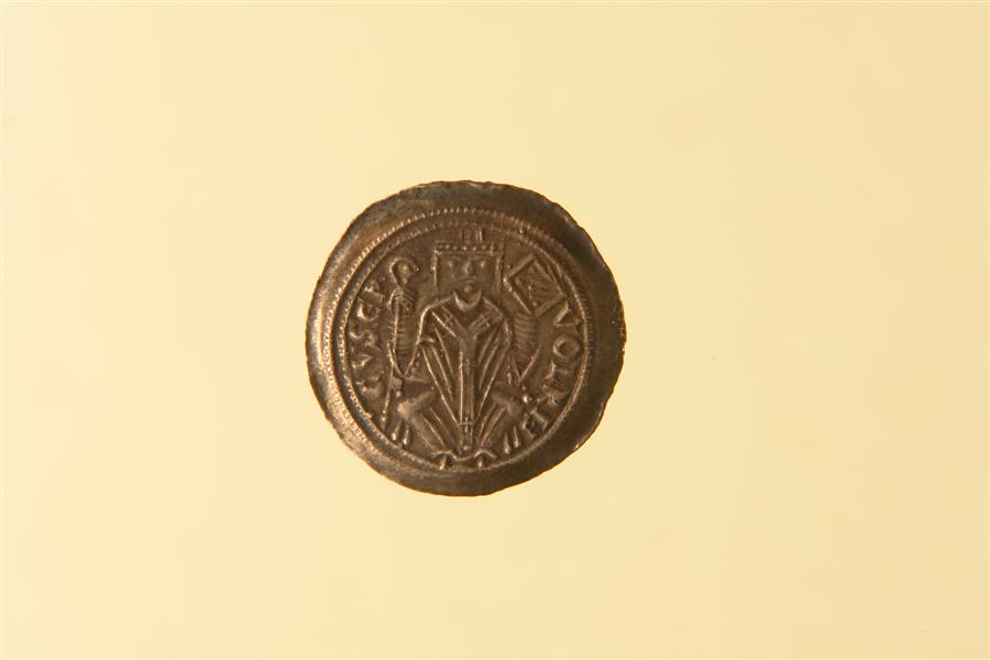 Vescovo mitrato seduto di fronte, tiene con la mano d. il pastorale e con la s., alzata, libro chiuso con borchie; cerchio perlinato VOLRI CVS(globetto)EP(globetto)