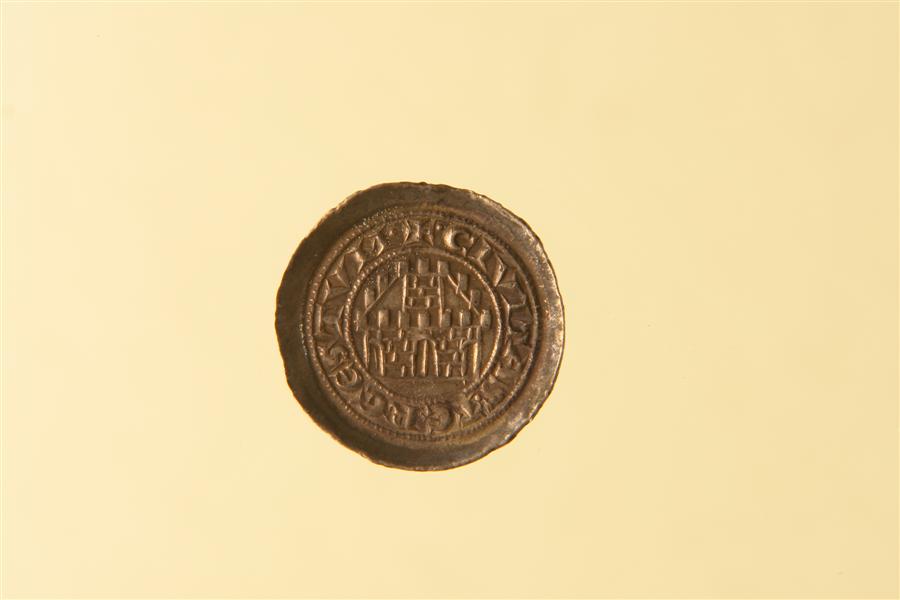 Cinta di mura merlate con tre porte; il portone centrale è chiuso (croce)(globetto)CIVITAS(globetto)TERGESTVM(globetto)