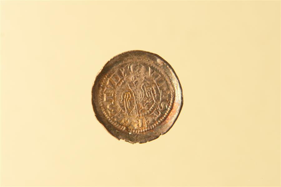 Vescovo mitrato seduto di fronte, tiene con la mano d. il pastorale e con la s., alzata, libro aperto; cerchio perlinato (globetto)ARLON GVS(globetto)EP(globetto)