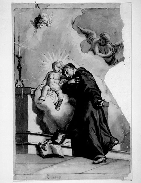 Sant'Antonio da Padova genuflesso presso un altere sul quale siede Gesù Bambino che gli cinge affettuosamente il collo. Sui gradini sono appoggiati una cestino, alcuni pani, il giglio e un libro. In alto a destra un angelo si affaccia dalle nubi, a sinistra due cherubini. Contorni a inchiostro color seppia e campiture eseguite al pennello con effetto di monocromo. Carta color avorio a grana medio-sottile. Controfondato,