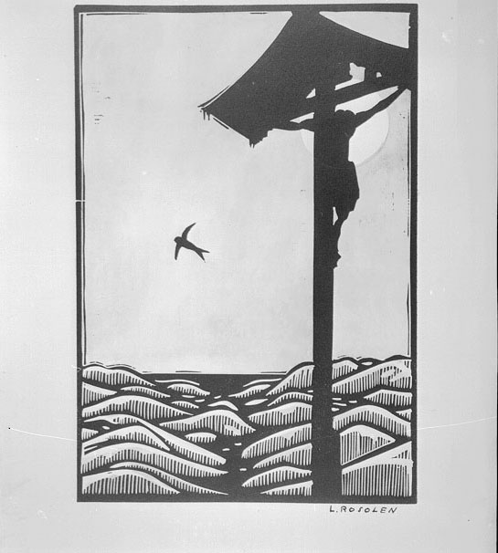 Paesaggio pianeggiante con crocifisso viario in primo piano sulla destra, che si staglia contro la lune, e rondine in volo. Sfumature lilla e celesti nel cielo e sulle dune. Il cerchio della luna è stato tracciato a matita con un compasso (si notano il piccolo foro al centro e il segno della matita anche sulla china all'altezza del torace del Cristo). La luna è lasciata in bianco. Carta avorio a grana grossa. Filigrana: P.M. FABRIANO (1934).