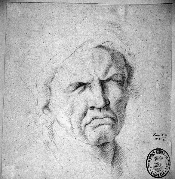 L'espressione sofferta del volto è accentuata dal chiaroscuro sulla destra, mentre a sinistra il copricapo è il colletto sono appena accennati. Tratteggio molto accurato e sapiente. Carta color biscotto a grana media, controfondato.