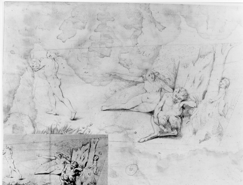 Il disegno raffigura un satiro addormenteto, appoggiato sul tronco di un albero con accanto una figura femminile semi sdraiata che addita una figura maschile che fugge con un satiro tra le braccia. L'episodio si svolge in un paesaggio naturalistico dove compare, nascosto dietro a un albero, un fanciullo.