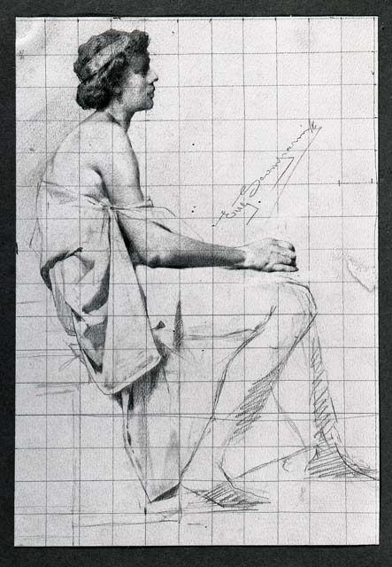 Figura femminile seduta di profilo destro che porta un nastro amò di coroncina sui capelli lunghi tenuti raccolti e indossa una veste slacciata che le lascia scoperte le spalle e la schiena. Le gambe sono appena abbozzate.