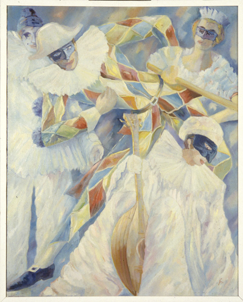 Il dipinto fu realizzato da Ferruccio Del Frate nel 1986. Venne lasciato come omaggio alla Scuola Mosaicisti da parte del pittore in cambio di un mosaico in smalto, realizzato in base ad esso dagli allievi del III Corso (ASM, reg. 4, part. 4216). Il soggetto rientra nel repertorio pittorico tipico di Del Frate che, nella convinzione che l'opera d'arte debba essere portatrice di un messaggio umano semplice e diretto, dipinge un mondo fantasioso e vitale, fatto anche di allegri buffoni, di malinconici clown, di Arlecchini pazzerelloni e tristi Pierrot.