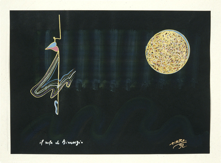 Il dipinto fu realizzato da Marcello Pirro nel 1992. Egli interpreta la realtà e la trasforma in un mondo di sogni e di immagini simboliche. Il bozzetto schedato raffigura l'unione tra l'uomo e la donna identificati rispettivamente nella farfalla e nel sole. Il cartone fa parte di una serie che non è stata utilizzata dai mosaicisti per una successiva traduzione in mosaico, ma è tuttavia conservata nell'archivio della Scuola, a testimonianza della frequentazione dell'Istituto da parte dell'artista, che periodicamente, da trent'anni, viene a Spilimbergo.