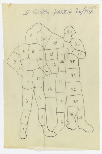 Il lucido costituisce il piano di posa per il gruppo dei due atleti in riposo collocati in alto sulla parete a dx del grande fregio. Il gruppo di due atleti era contrapposto a tre atleti in atto di spiccare la corsa, in alto si sovrapponeva un altro registro decorato con tre corridori disposti ritmicamente verso sinistra. I numeri sulle varie parti indicano che il lucido era un piano di posa per ricomporre i vari pezzi del mosaico e come tale non è autografo di Angelo Canevari, ma fu probabilmente tratto da suoi cartoni ad opera dei maestri della scuola. I mosaici parietali furono eseguiti su cartoni di Angelo Canevari; eseguiti con tessere colorate a smalto, occupavano gli angoli della piscina e la parete alla destra dell'ingresso. Le parti centrali delle pareti lunghe erano infatti occupate dalla tribuna e dalle ampie porte finestre, una parete corta era finestrata e quindi il fregio fu posto su quella opposta. Sull'angolo destro rispetto all'ingresso erano rappresentati due atleti in riposo, cui corrisponde il piano d i posa schedato, e due gruppi di tre corridori, rivolti in direzioni tra l oro opposte. Queste figure di corridori furono copiate dagli atleti dipinti da Achille Funi nei "Giochi atletici italiani", un murale presentato nel 1933 alla Triennale di Milano. L'angolo sinistro rispetto all'ingresso era decorato con vari gruppi di atleti disposti su tre file: tuffatori, lanciatori del disco, lottatori, lanciatori del peso e del giavellotto, marcia tori. I cartoni furono utilizzati anche nei mosaici del viale del Monolite attribuiti a Canevari: più precisamente nei riquadri VII, XV, XVIII. Questi mosaici della parte sinistra furono eseguiti successivamente e non da maestranze spilimberghesi. All'angolo opposto confinante con i l fregio, sono rappresentati ancora sei tuffatori nelle varie sequenze de l tuffo, eseguiti contemporaneamente alla parete dx dalla scuola di Spilimbergo. Questi stessi cartoni furono riutilizzati da Canevari non solo nel le pareti della piscina, ma anche nel VII riquadro del viale, dove furono rappresentati tuffatori e nuotatori. Nelle figure degli atleti, invece, Canevari si ispirò ai cartoni che già aveva fornito per l'entrata allo stadio dei marmi. Il ricco archivio della scuola permette di ricostruire con esattezza le diverse fasi dei lavori. Nel dicembre 1934 Canevari aveva già approntato i bozzetti colorati in scala 1:10 e stava iniziando la stesu ra dei cartoni (ASM, b. 7 0, part. 57, lettera di A. Canevari a A. Baldini, Roma dicembre 1934) che fu rallentata da Renato Ricci poiché le murature non potevano essere completate per il 21 aprile (part. 54, lettera di A. Canevari a A. Baldini, Rom a 4 febbraio 1935). Canevari si raccomandò che il fondo delle figure fosse omogeneo soprattutto perché le pareti d'angolo sarebbero state "sempre un po' scure" (lettera di A. Canevari a A. Baldi ni, Roma 17 febbraio 1935). Solo nel luglio 1935 Canevari riprese ad eseguire i cartoni raffiguranti g li atleti per le pareti laterali, sperando di eseguirli con più rapidità d elle figure del fregio (lettera di A. Canevari a A. Baldini, s.d. ma lugli o 1935). La parete con atleti e corridori f u la prima ad essere eseguita d alla scuola, nell'ottobre 1935 Baldini ave va infatti risposto affermativamente alla richiesta di Renato Ricci per i l completamento delle pareti (b. 71, part. 108, lettera di A. Baldini a R. Ricci, Spilimbergo 17 ottobre 1935). Data l'esistenza di numerosi operai disoccupati si confermò a Ricci d i poter consegnare i lavori dopo due me si dalla spedizione dei bozzetti a colori e dei cartoni chiaroscurati al vero.
