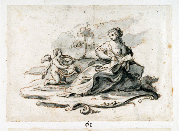 amorino con tromba e donna che scrive