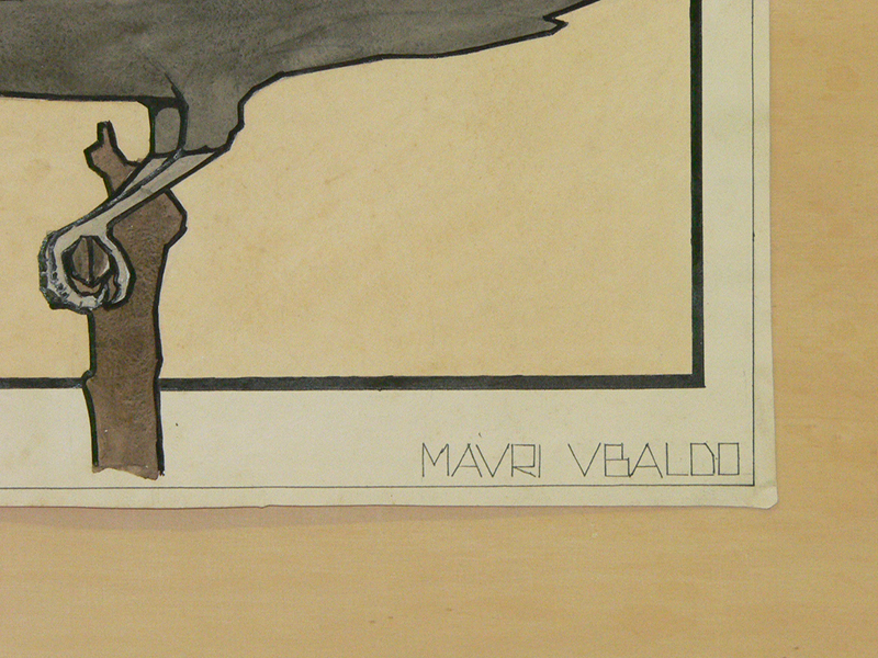 l'oggetto rappresenta un disegno di un corvo, visto di profilo, grigio-nero appollaiiato su un ramo marrone racchiuso in una cornice nera spessa 4 mm con uno sfondo chiaro, disegno preparatorio in graffite e stesura ad acquarello, sul lato superiore del foglio a destra è riportata la scritta "r scuola d'arte imdle", sulla sinistra "1 corso", sul lato inferiore a destra "Gradisca-3-3-1935 XIII" e a sinistra "Mauri Ubaldo" il nome dell'autore, tutte le scritte sono in stampatello maiuscolo