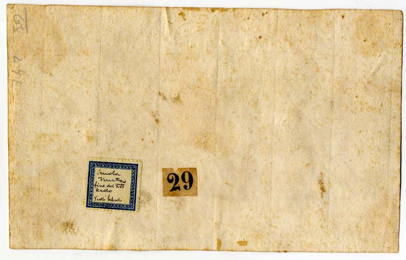 verso, angolo inferiore sinistro, etichetta: Scuola / Veneta / fine del XVI / sec. / vedi Sched.
