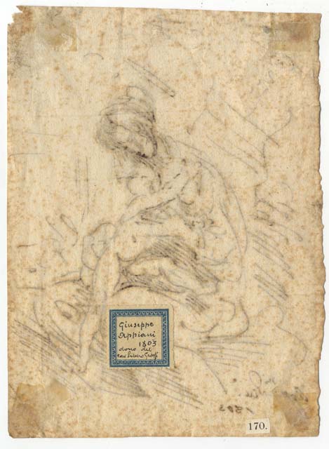 Il disegno è firmato Giuseppe Appiani e reca la data 1805 (interpretata anche come 1803) ritenuta apocrifa da Aldo Rizzi (1961; 1970), che assegnava il foglio al pittore rococò Giuseppe Appiani morto nel 1786 a Magonza e attivo in Germania durante tutta la sua vita professionale. La data e il luogo di nascita riportati nelle schede dallo studioso - Vaprio d'Adda 1740 - sono però quelle di un secondo omonimo pittore, nonché primo restauratore dei dipinti della pinacoteca di Brera (dal 1807), morto a Milano nel 1812 (cfr. Ticozzi 1830). L'attribuzione di Rizzi sembra dunque il frutto della confusione tra due personalità diverse, entrambe poco conosciute. Si può osservare tuttavia che il disegno in esame appare più coerente con lo stile neoclassico e che, inoltre, come nota Vania Gransinigh (comunicazione orale), l'inchiostro e la grafia della firma e della data sono gli stessi. Pare dunque possibile assegnare il foglio al più giovane dei due Giuseppe Appiani, al quale possono essere riferiti anche i disegni con numero di inventario 172, 173, 174. Questi ultimi provengono dalla stessa donazione e sono assegnati al medesimo artista dall'iscrizione presente sull'etichetta sul verso (che riporta la data 1803). Si sottolinea che la proposta attributiva dovrà essere verificata attraverso il confronto con l'opera grafica del maestro lombardo.