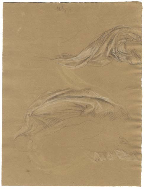 Il disegno rappresenta uno studio per un panneggio che si avvolge su un corpo maschile appena accennato, ad eccezione della coscia e del ginocchio sinistri. Sul verso, due studi di panneggio.