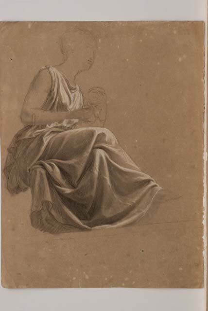 Il recto del foglio rappresenta plausibilmente la Caduta di Fetonte: Fetonte, figlio di Elio, è raffigurato mentre sta precipitando dal carro, raffigurato per sommi capi. In secondo piano, Giove che regge il proprio bastone osserva la scena. Sul verso, una figura femminile seduta di profilo, con la gamba destra accavallata sulla sinistra, avvolta in una veste all'antica restituita in maniera impeccabile grazie all'utilizzo di carboncino e diffuse lumeggiature a biacca su carta marrone. Tra le mani la donna tiene quello che potrebbe sembrare un calice