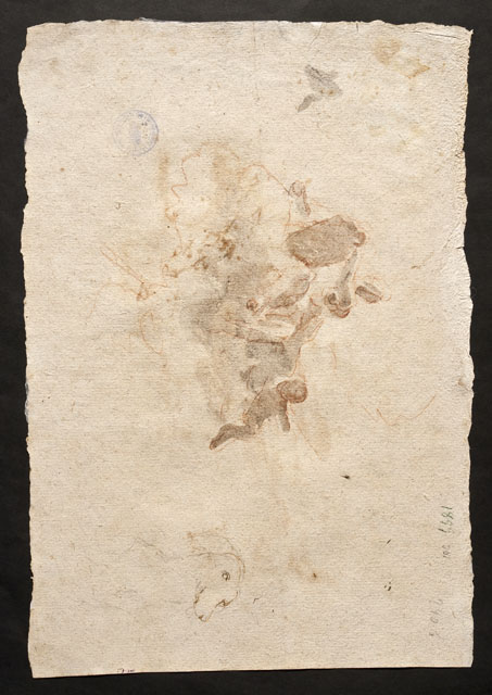 Al recto: figura stante di santo barbuto e calvo (San Paolo) che tiene le mani sull'elsa di una lunga spada, la punta della cui lama poggia a terra. Al verso: gruppo di figure su una nube, con al centro una figura femminile seduta che regge un grande specchio (?) e a sinistra un puttino; in basso a destra, studio per la testa di un cane.