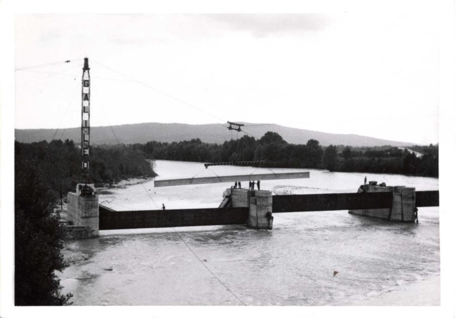 Gorizia, Isonzo. Visita al cantiere di bonifica; opere di sbarramento: dettaglio della diga. Particolare dello sghiaiatore