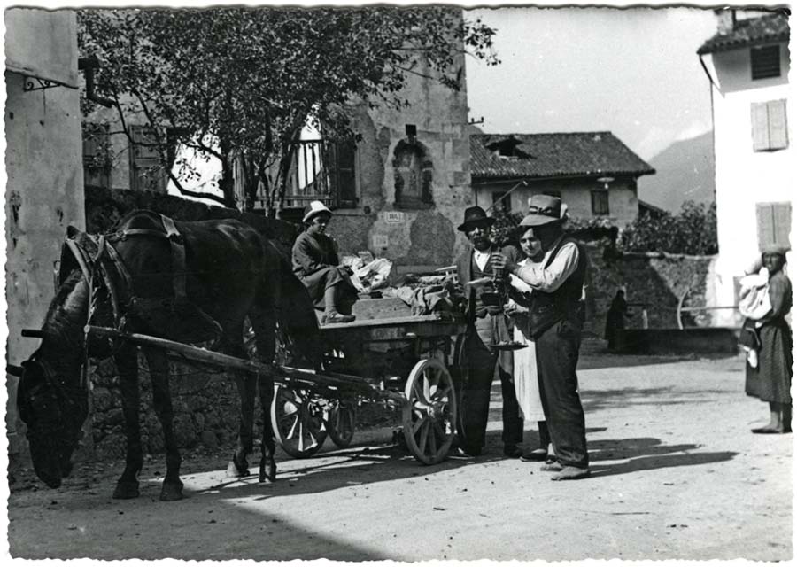 Il carro del ......è fermo in piazza 22 luglio a Sutrio; alcune persone lo attorniano. Tra queste la signora Ernesta con in braccio il piccolo Gigi. Sullo sfondo la fontana