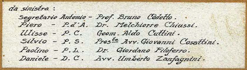 Il C.L.N. Provinciale. Da sinistra: Bruno Cadetto "Antonio" segretario, Melchiorre Chiussi "Piero" (P.d'A.), Aldo Cuttini "Ulisse" (P.C.), Giovanni Cosattini "Silvio" (P.S.), Giacomo Filaferro "Paolino" (P.L.), Umberto Zanfagnini "Daniele" (D.C.)