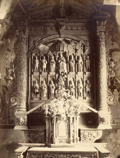 Illegio: Pieve di San Floriano: Altare contenente l'ancona lignea di Domenico da Tolmezzo (1497) composta da quattordici statue.-