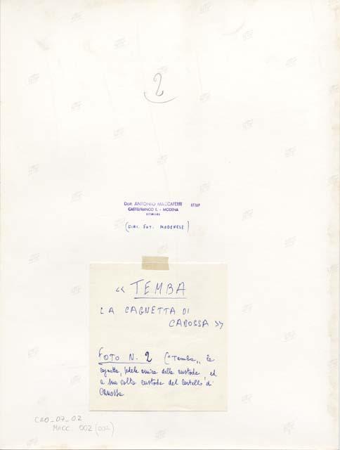in basso al centro: 2) (in matita) (CIRC. FOT. MODENESE) "TEMBA LA CAGNETTA DI CANOSSA" n.3 (Foto N.2 ("Temba" la cagnetta, fedele amica della custode, ed a sua volta custode del castello di Canossa).
