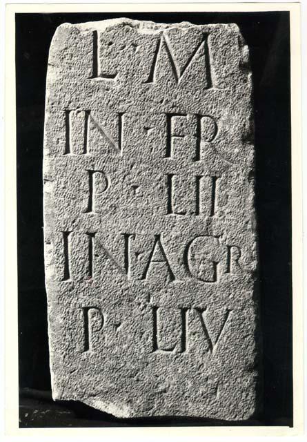 supporto primario, verso: 4622/76/ 5 . 963 6 6/ Terzo di Aq./ casa Prister/ Cm. 55x29.5x13 spess. Aurisina/ alt. lettere cm. 7.8; 6.3; 5.8; 6.5; 6.2