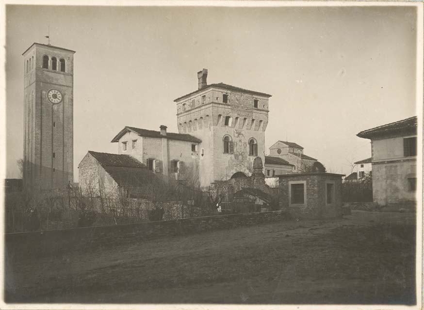 Veduta dell'abbazia di Santa Maria in Sylvis, del campanile e della torre d'ingresso al complesso, ripresi da sud, a Sesto al Reghena, alla fine dei restauri del primo quarto del '900.