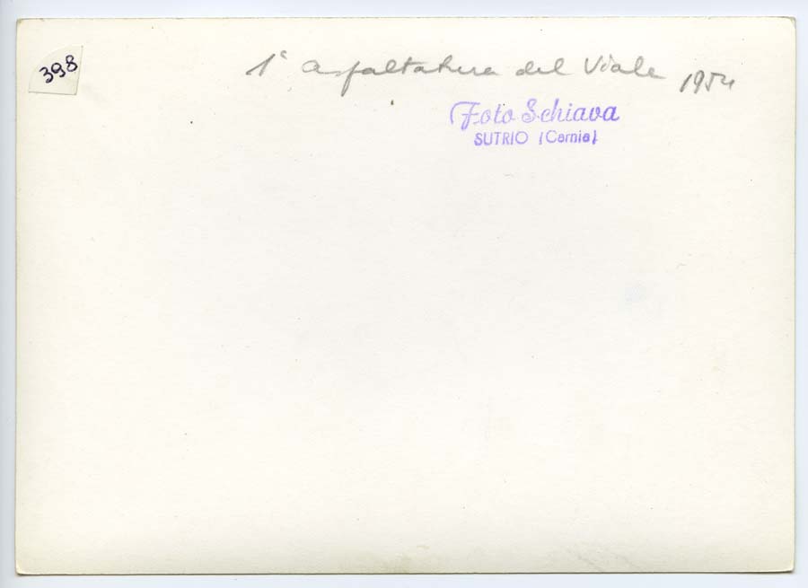 Lavori di asfaltatura sul viale dei Martiri a Sutrio; dei macchinari procedono lungo di esso. Ai lati della strada sono visibili cumuli di cubetti. Lungo il viale sono presenti alberi e cespugli.