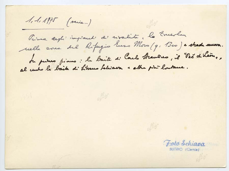 sul verso: 1.1.1975 (serie...)/ Prima degli impianti di risalita, lo Zoncolan nella zona del Rifugio Enzo Moro (q 1300) e strada nuova./ In primo piano. la baita di carlo Straulino, il "Peč di Leŏn",/ al centro la baita di Silvano Schiava e altre più lontane.