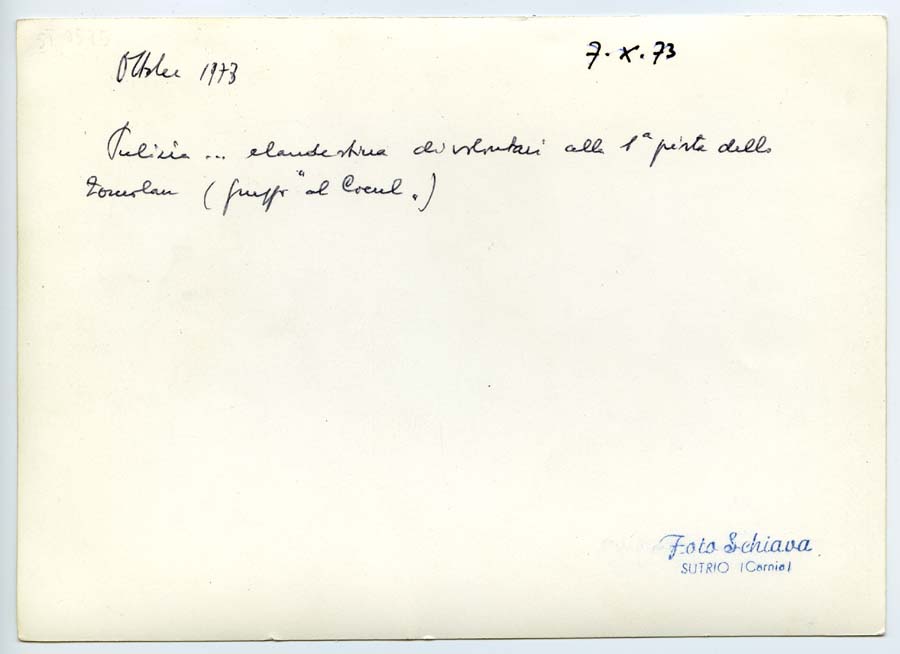 sul verso: ottobre 1973/ 7.X.73/ Pulizia... clandestina di volontari alla 1a pista dello/ Zoncolan (gruppo "al Cocul")