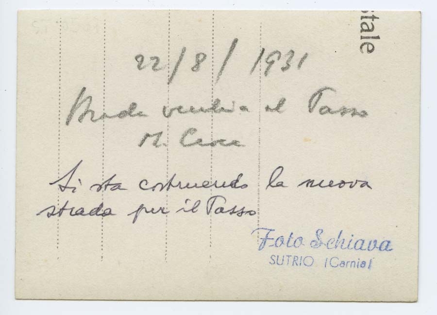 sul verso: 22/8/1931/ Strada vecchia al Passo/ M. Croce/ Si sta costruendo la nuova/ strada per il Passo