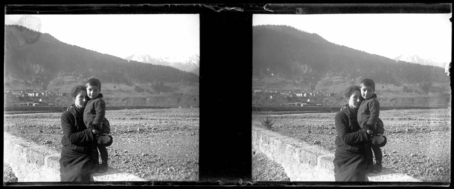 Una donna, seduta su un muretto, abbraccia teneramente il figlioletto. A sinistra la strada sterrata che conduce all'abitato di Sutrio di cui si intravedono le prime case