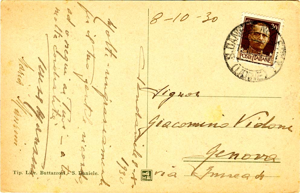 verso: San Daniele 8-X-/1930/ Molti ringraziamenti/ per il tuo gentile ricordo,/ ed ossequi ai tuoi - a te/ molte cordialità/ Teresa Manzini/ Maria Manzini/ Signor/ Giacomino Vidoni/ Genova/ Via Invrea 4