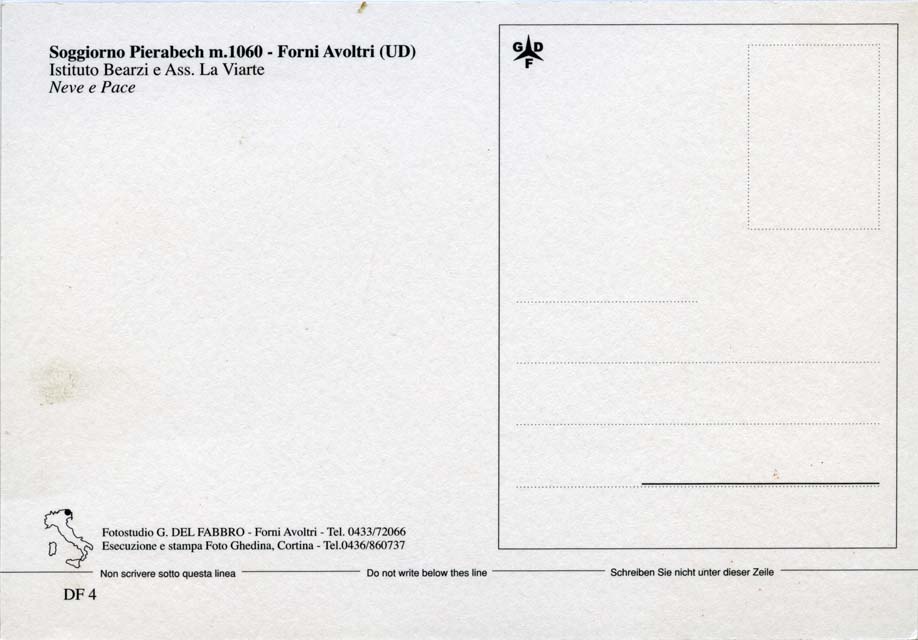 verso, in alto, a sinistra: Soggiorni Pierabech m. 1060 - Forni Avoltri (UD)/ Istituto Bearzi e Ass. La Viarte/ Neve e Pace