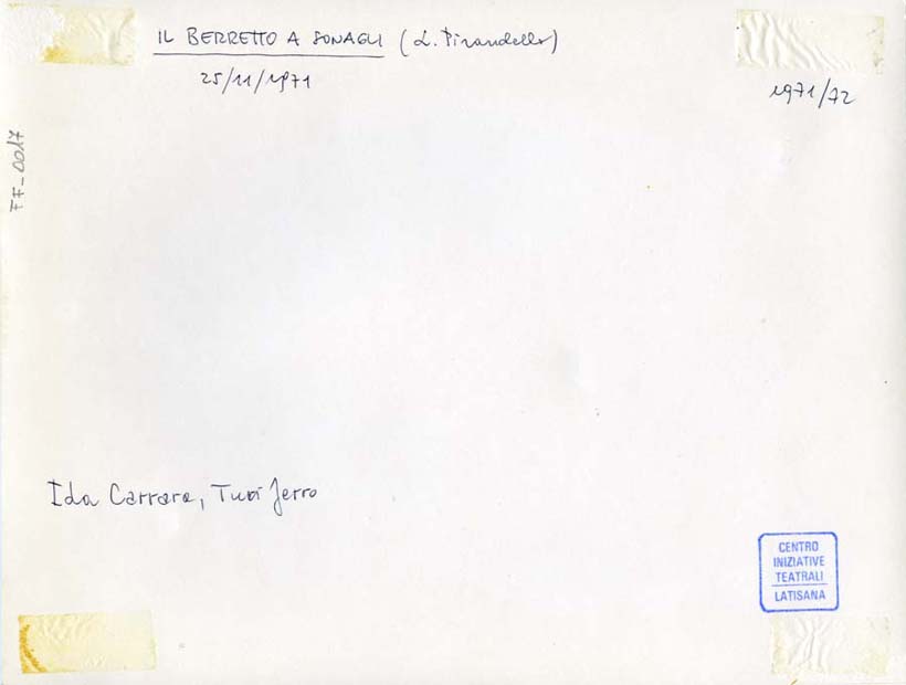 sul verso, in alto a sinistra: IL BERRETTO A SONAGLI (L. Pirandello)/ 25/11/1971
