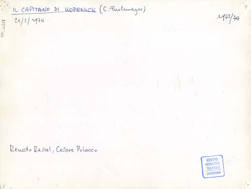 sul verso, in alto a sinistra: IL CAPITANO DI COPENICK (C. Zuckmayer)/ 21/3/1974
