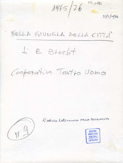 sul verso, in alto al centro: 1975/76/ NELLA GIUNGLA DELLE CITTA'/ di B. Brecht/ Cooperativa Teatro Uomo