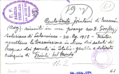 sul verso della fotografia: Centotrenta friulani di Tucumán / (Arg.) riuniti in un pranzo con D. Giov. Nazzi / Salesiano di Sclaunicco - 24 Ag. 1958 - mentre / ascoltano la trasmissione in disco dei saluti di / Pasqua dei parenti in Italia - gentile e delicato / ossequio di "Friuli nel Mondo"; timbro, in alto a sinistra: F.F. FAMILIA FRIULANA Av. MITRE 312 Tucumán (Arg.)