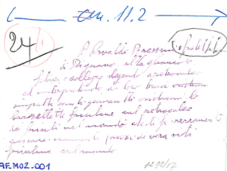 sul verso della fotografia: P. Osvaldo Peressini e Fratel Saleri / di Dignano al Tagliamento / felici e allegri legendo / ed interpretando ai loro bravi / simpatizanti giovanotti cristiani le / barzellette friulane sul rotocalco / del Friuli nel Mondo che li fa veramente / passare momenti anzi di vera vita / friulana nel mondo
