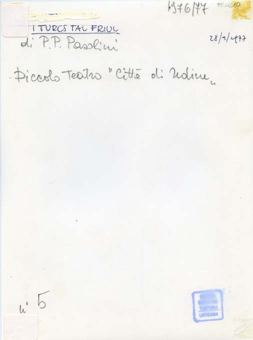 sul verso, in alto a sinistra: di P. P. Pasolini/ Piccolo Teatro "Città di Udine"