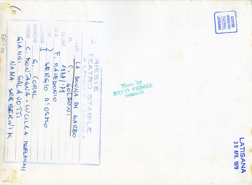 sul verso, in basso a sinistra: LA DONNA DI GARBO/ C. GOLDONI/ 1978/'79/ F. MACEDONIO/ SERGIO D'OSMO/ G. CORAL/ C. MONTAGNA - LUCILLA MORLACCHI/ GIANNI GALAVOTTI/ NADIA SREBERNIK