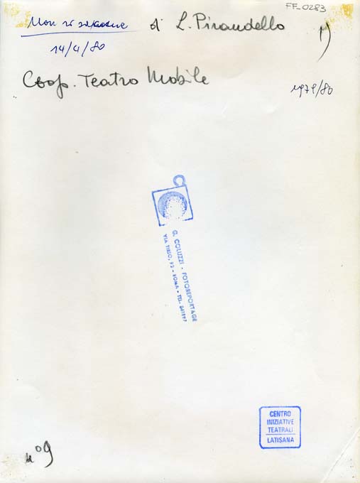 sul verso, in alto: di L. Pirandello/ Coop. Teatro Mobile/ 1)