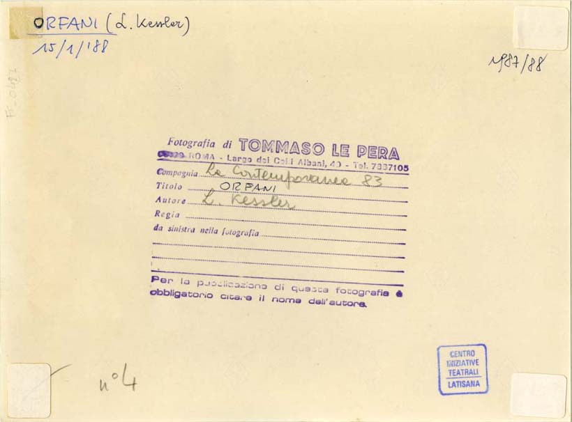 sul verso, in alto a sinistra: ORFANI (L. Kessler)/ 15/1/'88