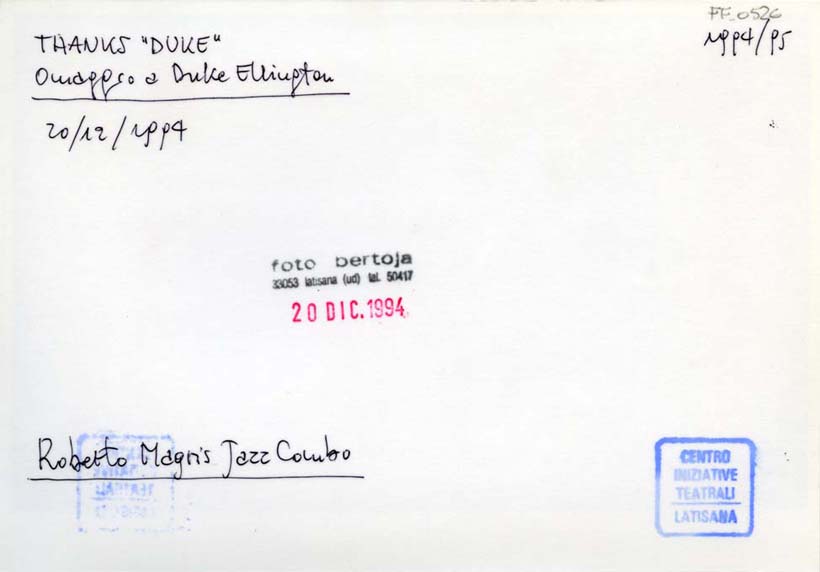 sul verso, in alto a sinistra: THANKS "DUKE"/ Omaggio a Duke Ellington/ 20/12/1994/ Roberto Magris Jazz Combo