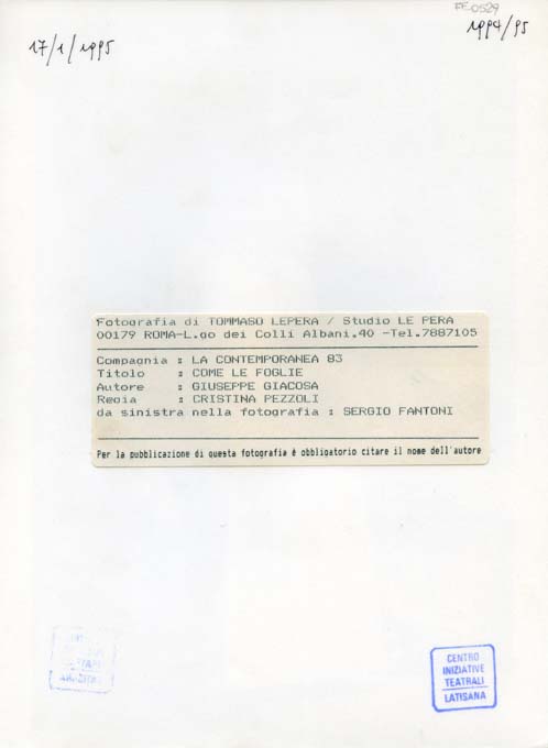 sull'etichetta, verso, al centro: LA CONTEMPORANEA 83/ COME LE FOGLIE/ GIUSEPPE GIACOSA/CRISTINA PEZZOLI/ da sinistra nella fotografia: SERGIO FANTONI