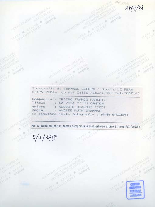 sull'etichetta, verso, al centro: TEATRO FRANCO PARENTI/ LA VITA E' UN CANYON/ AUGUSTO BIANCHI RIZZI/ANDREE RUTH SHAMMAH/ ANNA GALIENA