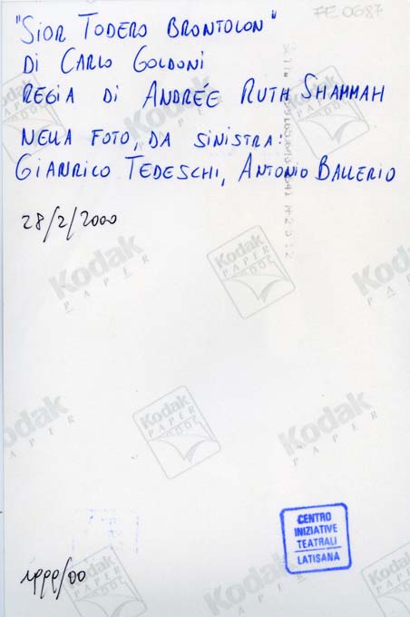 sul verso, in alto a sinistra: "SIOR TODERO BRONTOLON"/ DI CARLO GOLDONI/ REGIA DI ANDREE RUTH SHAMMAH/ NELLA FOTO, DA SINISTRA:/ GIANRICO TEDESCHI, ANTONIO BALLERIO/ 28/2/2000